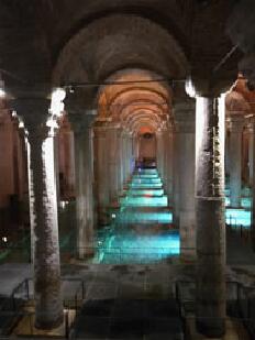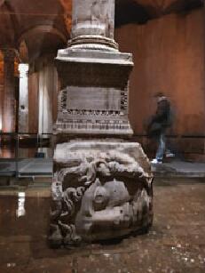 してある。とても神秘的。色々なところから寄せ集められたデザインがバラバラの柱が300本以上あり、いい味を出し ている。有名なメデューサの首も。一つは横向きで、もう一つは上下さかさま。置き方にアニミスム的な恐れみたいな ものを感じた。 ←けっこう広い。歩いてよいのは通路の上だけ。