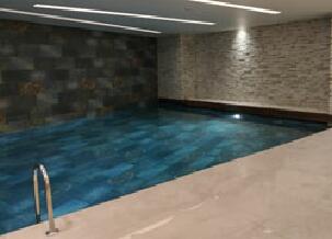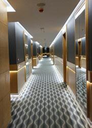 内してくれた。まず、靴の上にビニールカバーをつける。入り口は男女別。プールまで行くと男女混合。きれいな温水プ ールで、水温は28℃くらいで低めだった。プールを出たところにはジムまである。マシンがたくさん並んでいた。あと、ス パ、ハマムもあると書いてあった。リッチすぎる。水着もトレーナーも持ってきてないので、当然利用できなかった。 ←地下の温水プール ←廊下