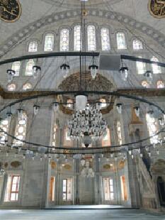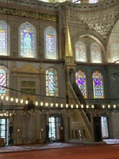 十分見応えがあった。モスクの構造は中央に広い空間と大ドームで、どこも大差ないのだが、内部の装飾にそれぞれ 個性がある。ここの天井装飾は明るくて、すっきりしていて落ちついた感じ。正面奥のフレスコ画?は大胆で豪華でバ ロック的だった。ここは18世紀半ばの建設なので、時代様式の関係だと思う。