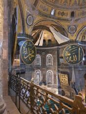 ザイクが一部残されていて、コーランのパネルとのコラボが他にはない味を醸し出していた。以前は博物館だったが、 最近モスクに再転換され、信者以外の外国人は2階のバルコニーからしか見学できないのだが、それはそれでけっこ う面白かった。1階のキリスト教関連のモザイク画は、宗教的な理由で布で隠されてしまっていたが。 ←信者席上部のモザイクは布で隠され…