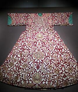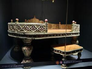寧に見学・鑑賞した。歴代スルタン(皇帝たち)とその家族のお宝がすごい。86カラットのダイヤモンドをはじめ、金銀 宝石を惜しげもなく使用した装身具や武器や玉座など、目がくらくらしてくる。おまじないの描かれたシャツやどてらに少 し似たところのあるカフタン(マント状の上着)など、衣服もすごく美しくて形もおもしろかった。 ←宝石で覆われた玉座