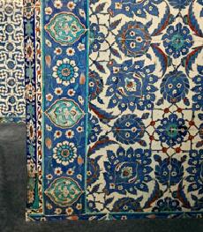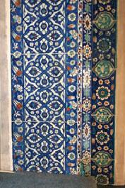 着いたモスク。というか、観光客は私たちだけで、10分以上たってからあと1組のカップルが来ただけ。現地人の姿も ない。しかし建物は外も中も様々な青いイズニックタイルで装飾されていて、めちゃくちゃ美しい。1500年代後半だけ に使われたという珍しいタイルだ。写真を撮りまくった。有名じゃなくても、見どころのあるモスクはたくさんあるようだ。 ←植物文様が多い
