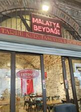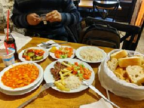 ョフテ(ビーフの肉団子)を頼んだ。ピラフ、角切りサラダ、ピクルス、パンもついてくる。最後に店からのギフトとしてチャ イも出てきた。 ←「歴史ある豆シチューの店」と書いてある