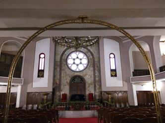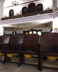 学。現役のものは初めて見た。厳かな独特の雰囲気がある。よく見ると、信者用の全椅子の下にはなんと黄色いヘル メットが設置されている。これもいざという時のための対策か。信仰は命懸けだ。 ←正面が祭壇 ←椅子の下を注目