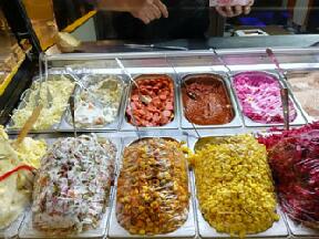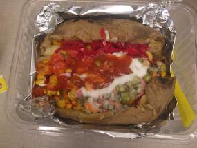 してみたかったのだ。ジャガイモ一つが日本の品種の3倍以上は大きい。皮付きのままふかしたイモを半割にし、チー ズや香辛料をまぜてマッシュドポテト風に加工した後、ソーセージやマッシュルームサラダ、コーンやピクルスなど10種 類以上あるトッピングを好きなように選んで、乗せてもらう。最後にマヨネーズとケチャップ。すごいボリューミーだ。テイ クアウトにしてもらって、宿で食べた。おいしかったが、もう少しシンプルにポテトの味を楽しむようにした方がいいかも、 とは思った。