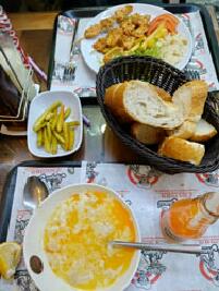 煮込みのスープだった。スープの部分はおいしかったけど。モツ(羊の胃袋)は1cm角以下に切ってあり、半透明、ど んぶりの下半分を占める。トンチャンより柔らかく煮てある。でもさすがに全部は食べきれなくて、残すことにした。仕方 がない。他はシシケバブ(チキン串焼きプレート)炭火焼の味といつもついてくるすっぱ辛いピクルスとパン。 ←左下が問題のスープ「イシュケンベ・チョルバス」。おいしそうだが…