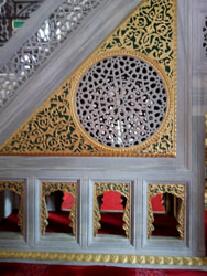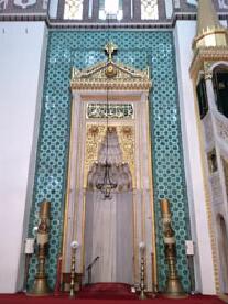 いつものような信者スペースのための立ち入り禁止区域が設定されてないので、奥まで行って鑑賞できる。とはいって もなんか遠慮してしまうのだが。ミフラーブの青緑色タイルが美しく、繊細なミンバルの装飾も間近に見られて感動し た。 ↓ ←ミンバルの側面